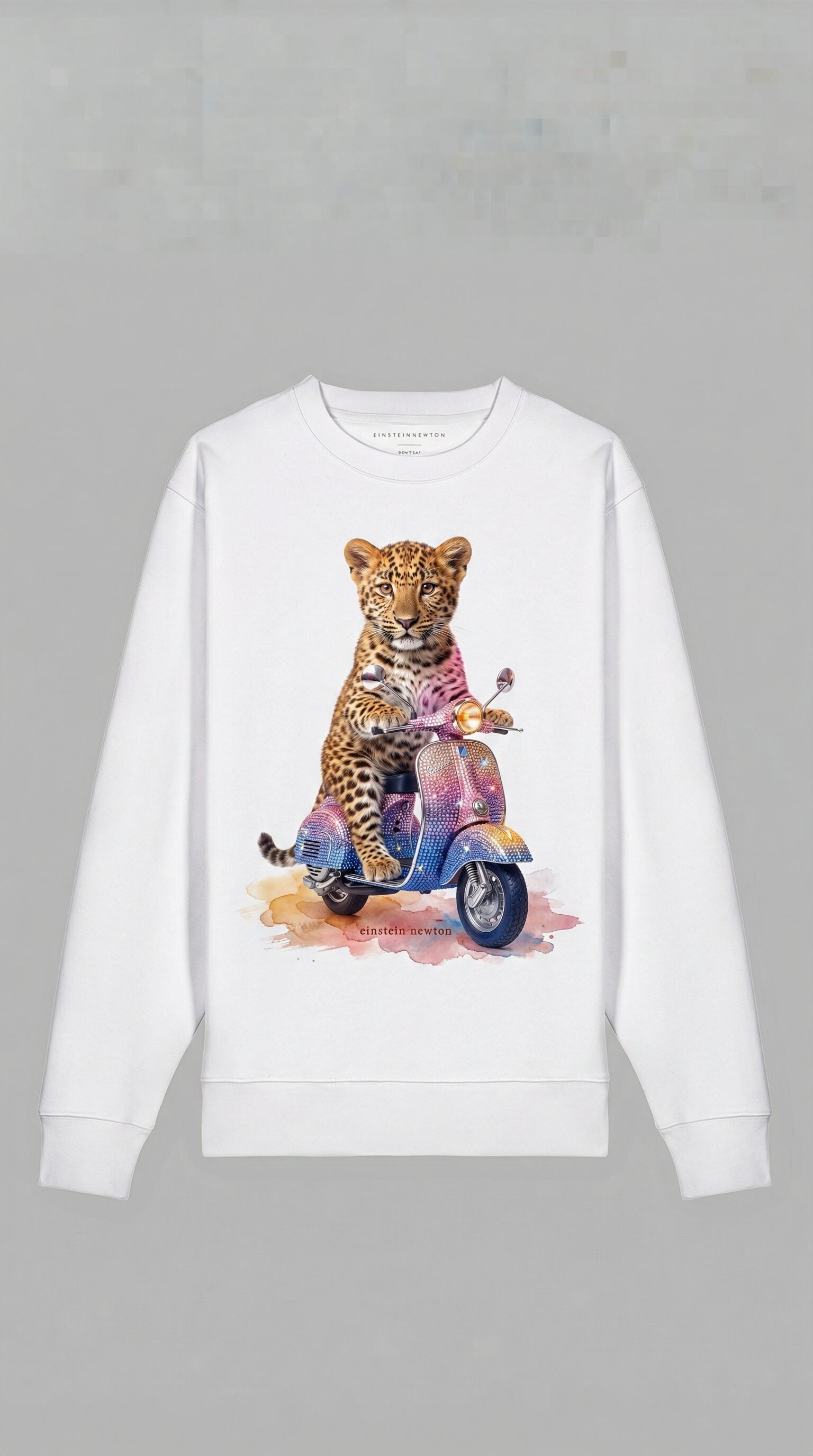„Aus dem Weg, ich hab einen Termin." Das kleine Leopardenbaby dreht den Gasgriff seinm glitzernden Scooter auf und schießt los – mitten durch die Innenstadt, vorbei an Taxis und Fahrradkurieren. Die Roller-Lackierung funkelt in Pink und Blau, als hätte jemand einen Regenbogen in Diamanten getaucht. Du stehst am Straßenrand, dein Kaffee kippt vor Staunen aus der Hand. Der Mini-Leopard bremst nicht. Er hupt nicht. Er schaut dir einfach direkt in die Augen, als wäre er der Boss dieser Stadt – und fährt weiter 🐆✨ Seitdem weißt du: Stil hat nichts mit Größe zu tun. Nur mit Attitude.