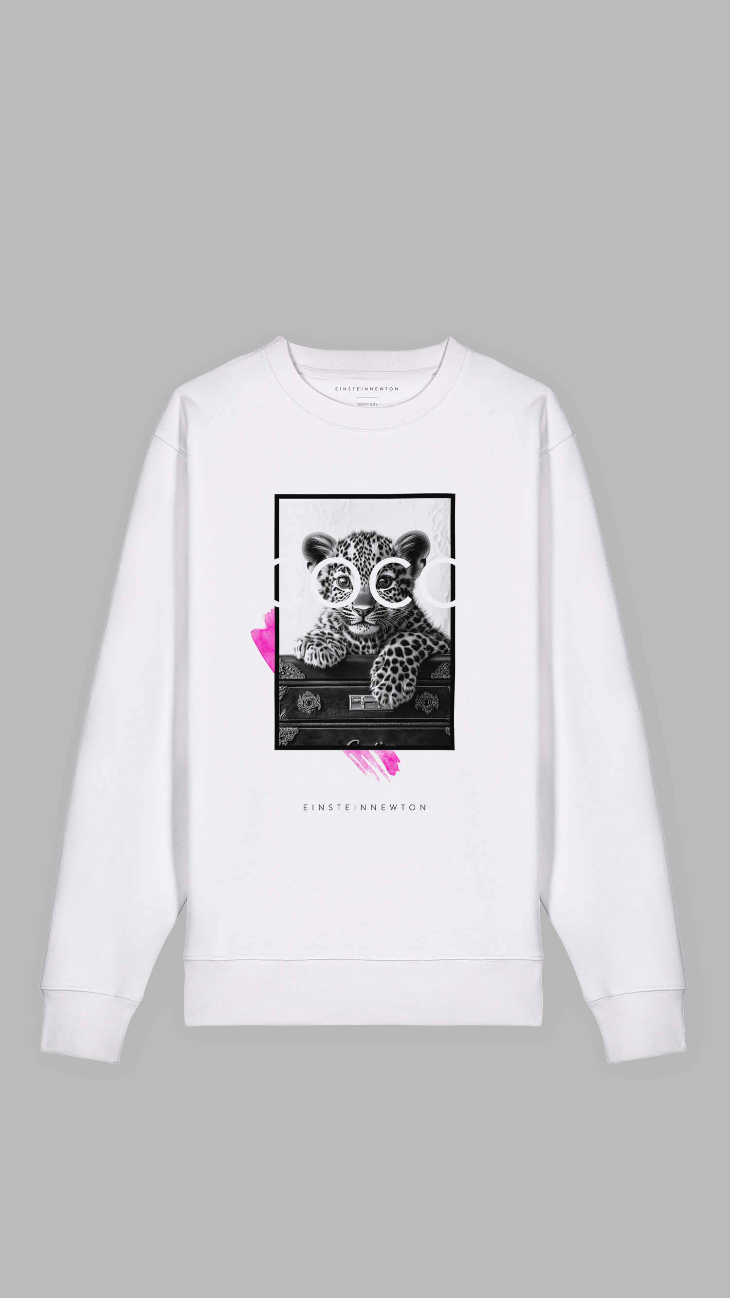 Der Jewelry Leopard Sweater ist ein Fashion-Statement mit Attitude – elegant, verspielt und ein bisschen rebellisch. Das schwarz-weiße Motiv zeigt einen jungen Leoparden, der lässig auf einer Schmuckbox liegt.