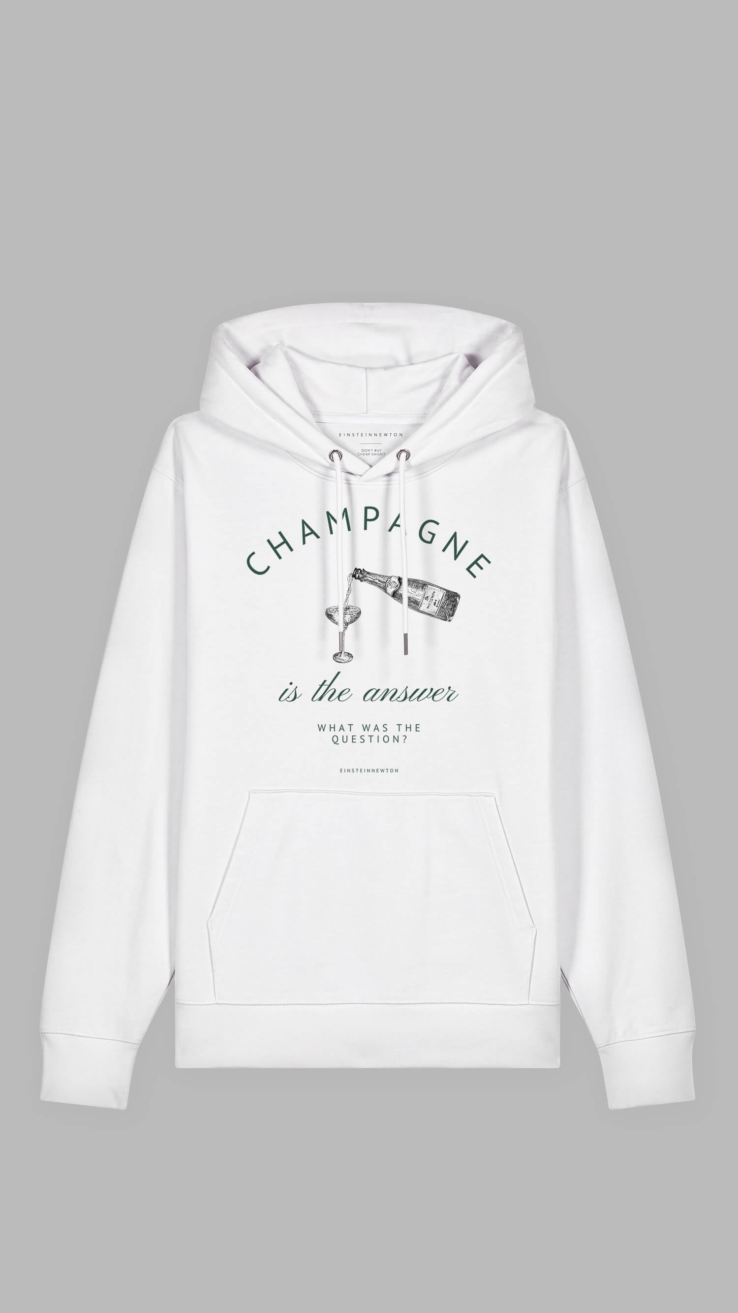 Dieser Hoodie hat die Antwort auf alles – oder zumindest auf jeden Freitagabend. Mit seinem cleanen Design und dem charmanten Print bringt er einen Hauch von Luxus und Humor in deinen Alltag. Die Illustration zeigt eine geöffnete Champagnerflasche, die in elegante Gläser einschenkt – spritzig, stilvoll und ein bisschen frech.