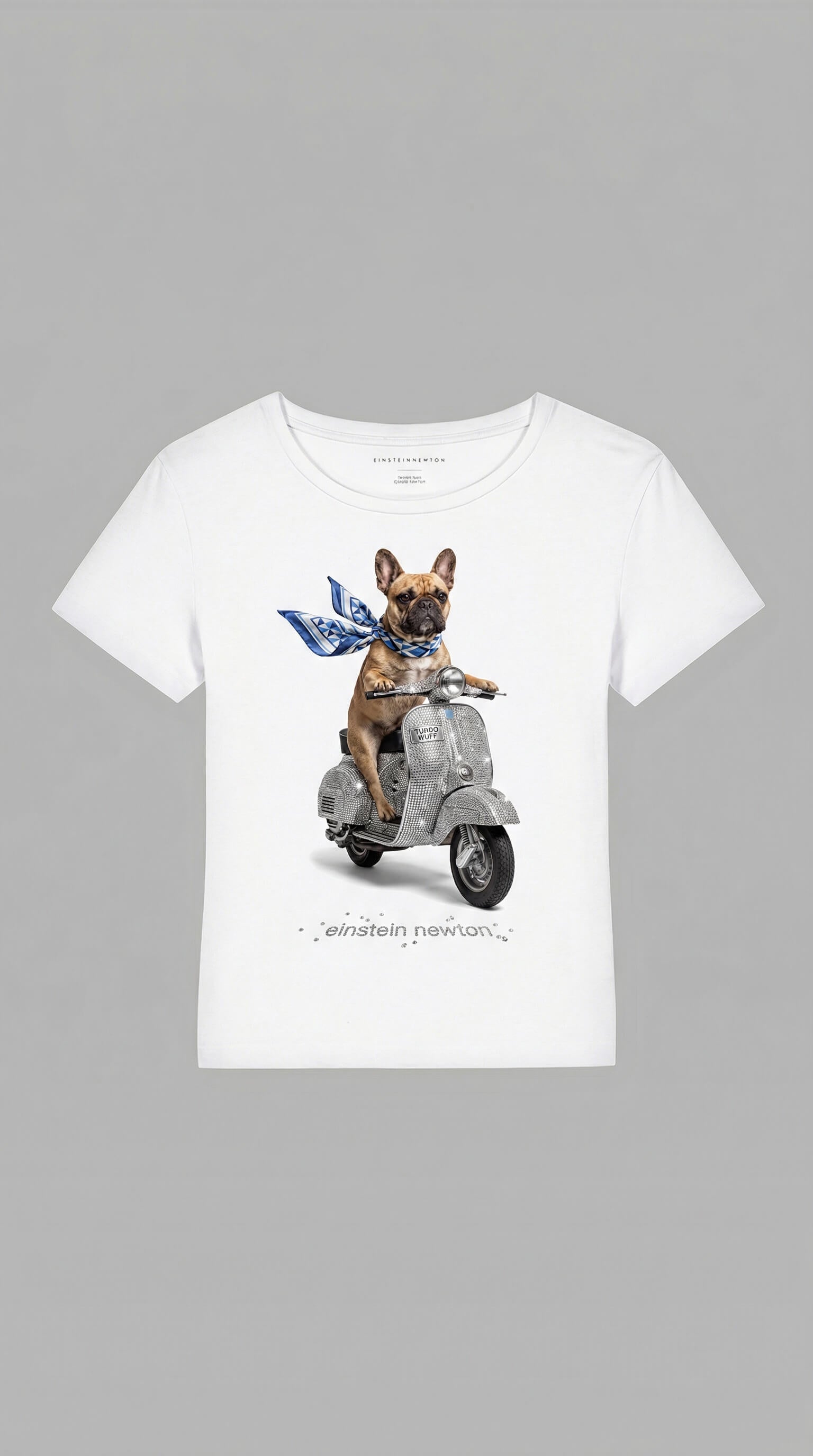 Man greift nach dem Lenker, dreht den Gasgriff auf – und plötzlich hat eine Französische Bulldogge die Kontrolle übernommen. Mit blauem Halstuch im Wind und Pfoten fest am Chrom schießt der kleine Kerl auf seinem silbernen Scooter durch die Gassen, als hinge das Schicksal der freien Welt von dieser einen Fahrt ab. Fußgänger springen zur Seite. Tauben explodieren in alle Richtungen. Und er? Schaut geradeaus, Kinn erhoben, kein Blinzeln. Die Mission ist klar: Eiscafé, dritte Straße links. Ankunft in zehn Sekunden. 🛵 Niemand hält einen Hund mit Stilbewusstsein auf – niemand. Das Halstuch flattert wie eine Flagge des Triumphs, als er in die letzte Kurve legt. Legende. 🐶