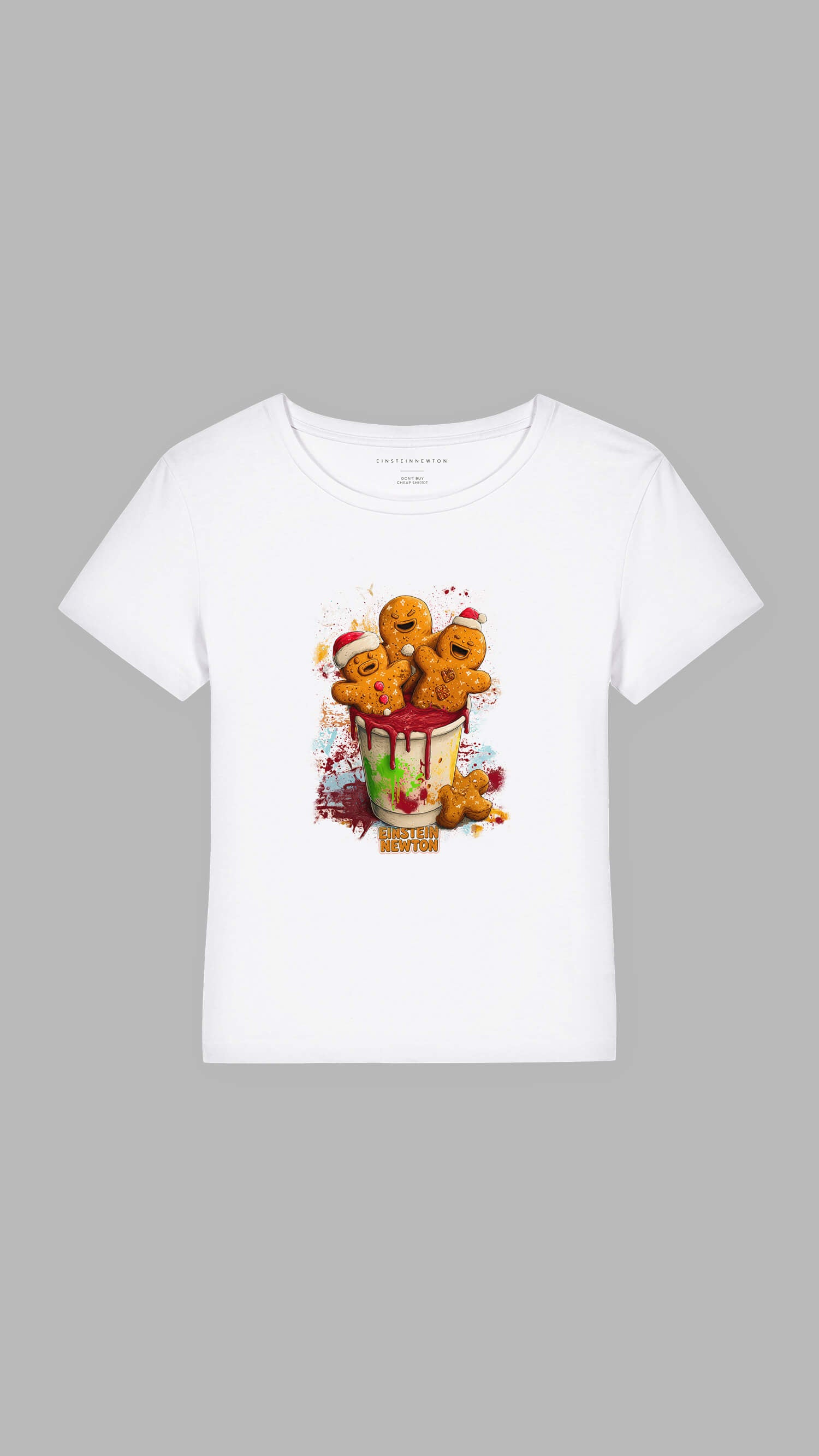 Weihnachten kann kommen – und zwar mit einer Extraportion Kekslaune 🍪🎅 Auf diesem weißen T-Shirt feiern drei freche Lebkuchenmännchen eine wilde Party in einer Tasse mit rotem Zuckerguss. Zwischen bunten Farbklecksen und Weihnachtschaos steckt jede Menge Humor – perfekt für alle, die Weihnachten nicht zu ernst nehmen und lieber mit einem Grinsen genießen 😜