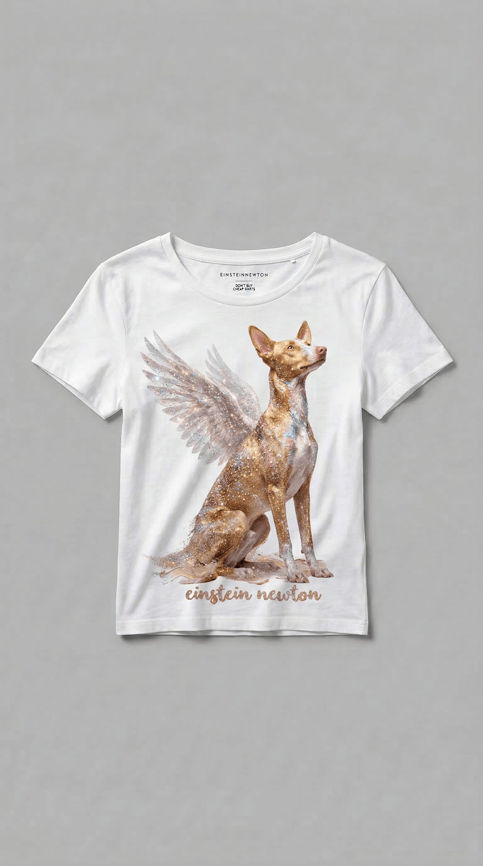 Jeder Hund glaubt, er kann fliegen. Vom Sofa aufs Bett, vom Bett auf dich, von dir runter zum Napf – und wieder hoch. Immer mit diesem Blick nach oben, als würde da oben jemand Leckerlis werfen. Dieser hier hat sich einfach Flügel wachsen lassen. Sitzt da, golden, funkelnd, den Kopf erhoben, als hätte der Himmel gerade seinen Namen gerufen. Kein Bellen, kein Schwanzwedeln. Nur Haltung. Wie ein Hund, der genau weiß, dass er das Beste ist, was dir heute passiert. 🐕✨ Einstein Newton hat ihn auf ein Shirt gedruckt – damit du ihn überall hin mitnehmen kannst, ohne Leine.