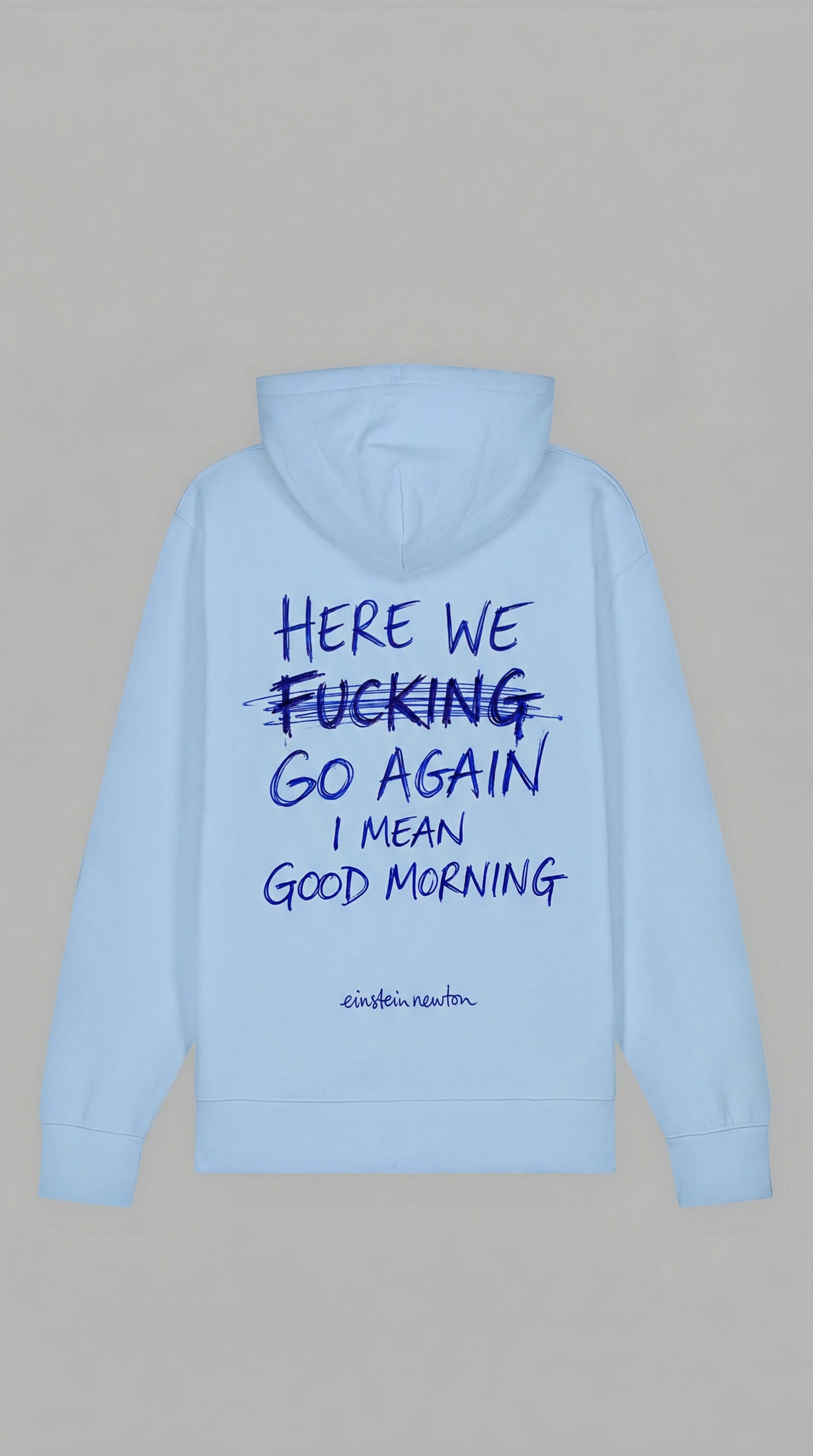 Ich starre auf meinen Wecker und denke exakt einen Satz – den ehrlichen. Dann streife ich mir diesen Hoodie über, drehe mich zur Tür und meine Mitbewohnerin liest meinen Rücken. "Here we fucking go again" steht da, aber das "Fucking" ist durchgestrichen. Darunter die Korrektur: "I mean Good Morning." Sie prustet los, ich halte mein Pokerface. Genau so funktioniert mein Morgen jetzt jeden Tag: Der Hoodie sagt, was ich denke, streicht es in letzter Sekunde durch und rettet meine soziale Existenz. Das Büro-Meeting um neun? Überlebt. Der Smalltalk im Aufzug? Gerettet. Meine wahre Meinung über Montage? Sichtbar, aber offiziell dementiert 😏🔥