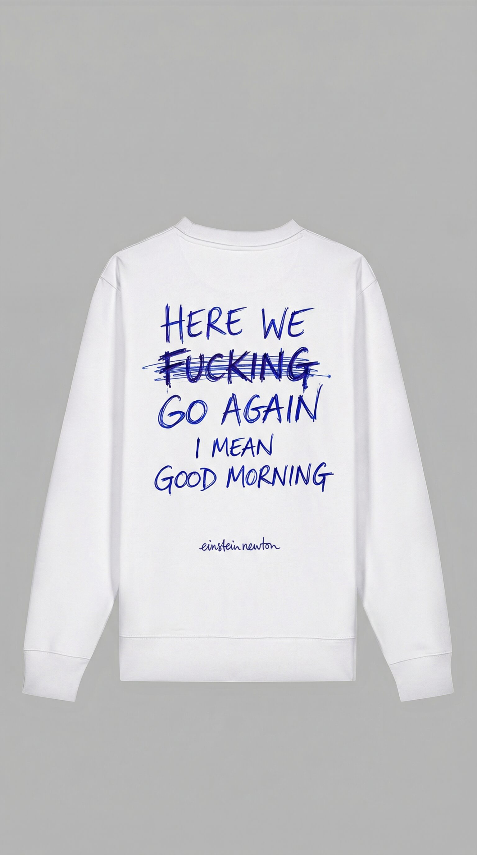 Der Wecker klingelt um 6:14 Uhr und man greift zum ersten Gedanken des Tages – HERE WE FUCKING GO AGAIN. Man schreibt ihn sogar hin. Dann hält man inne, streicht das Wort durch und korrigiert sich hastig: I MEAN GOOD MORNING. So beginnt man jeden Montag, jeden Dienstag, eigentlich jeden Tag. Die Korrektur steht da, aber sie überzeugt niemanden. Schon gar nicht einen selbst. Das Büro sieht den durchgestrichenen Fluch auf dem Rücken, nickt wissend und reicht wortlos den Kaffee rüber ☕. Seitdem gilt im gesamten Großraumbüro eine ungeschriebene Regel: Niemand spricht vor dem zweiten Espresso. Das Sweatshirt hat mehr für das Betriebsklima getan als jede Teambuilding-Maßnahme 😏🔥