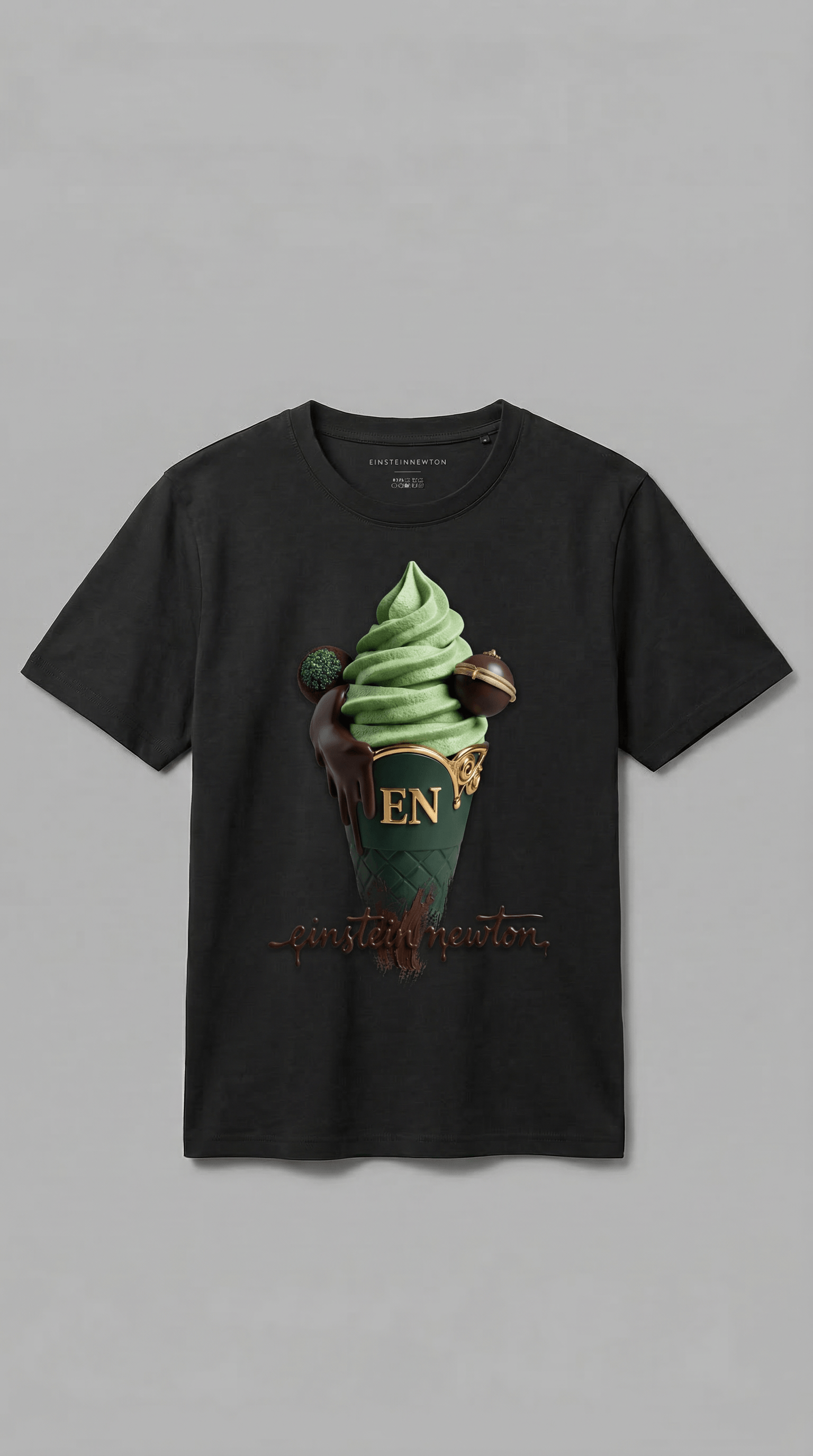 Man entscheidet sich gegen die normale Kugel Vanille – und greift zur Waffel mit dem goldenen Emblem. Sofort ändert sich alles. Die Matcha-Softeis-Spirale thront über dunkler Schokolade, flankiert von handgefertigten Pralinen, während die Glasur langsam über den goldverzierten Rand tropft. Kein Streetfood. Haute Cuisine in Waffelform. Wer diesen Print trägt, hat verstanden: Geschmack ist keine Frage des Menüs, sondern der Haltung 🍦👑 Ein einziger Blick genügt – und jeder weiß, welche Sorte hier bestellt wird.
