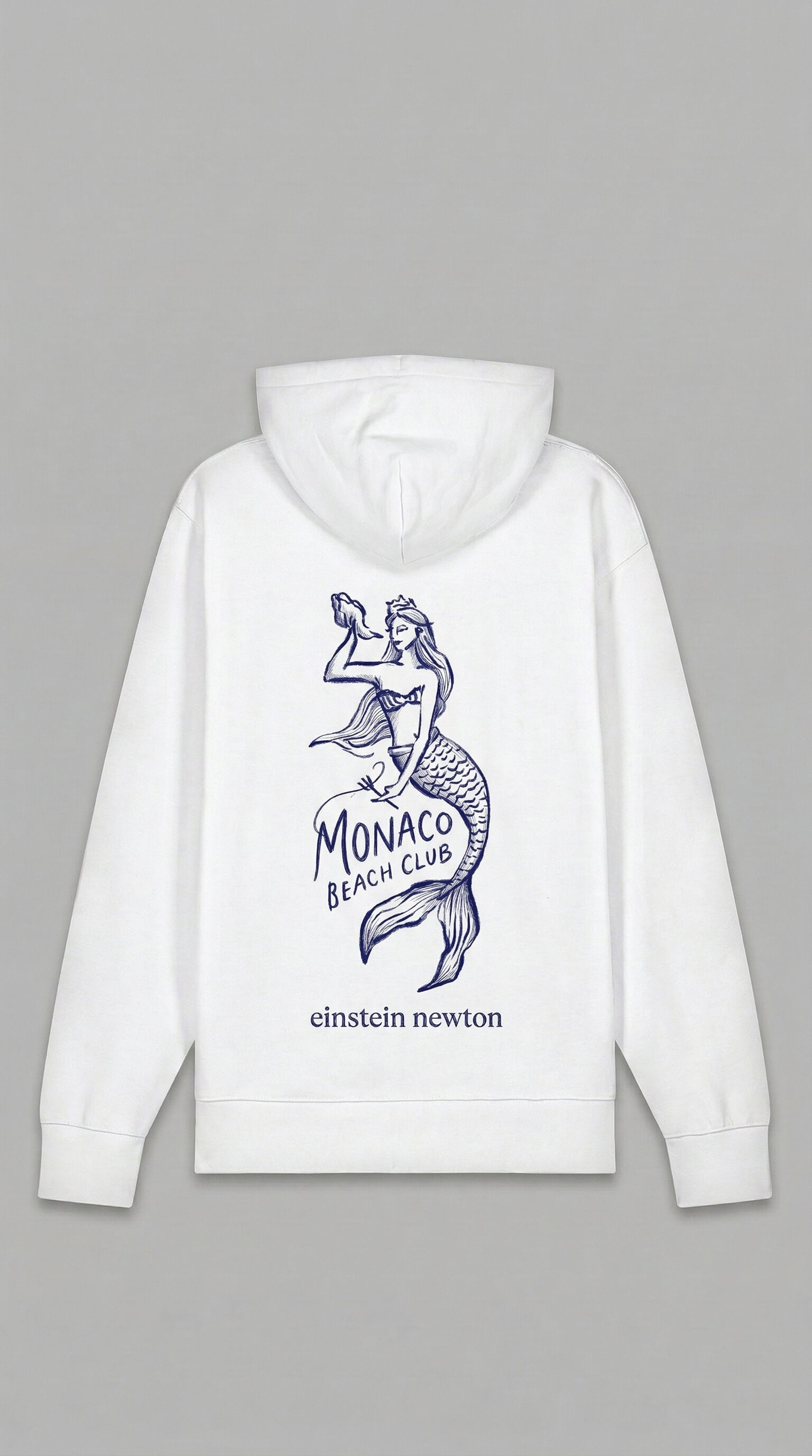 Der Brooklyn Hoodie von Einstein Newton aus weicher Bio-Baumwolle ist dein Beach-Club-Upgrade für den Alltag. Der marineblaue Meerjungfrau-Print auf weißem Stoff bringt Côte-d'Azur-Stimmung in jede Stadt. Perfekt für Männer, die ihren Sommer-Hoodie lässig zur Short oder zur Jeans tragen – am Wasser, in der Bar oder einfach überall.